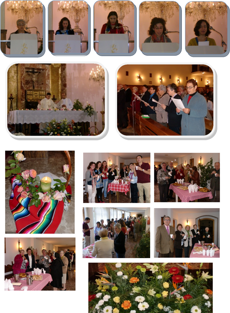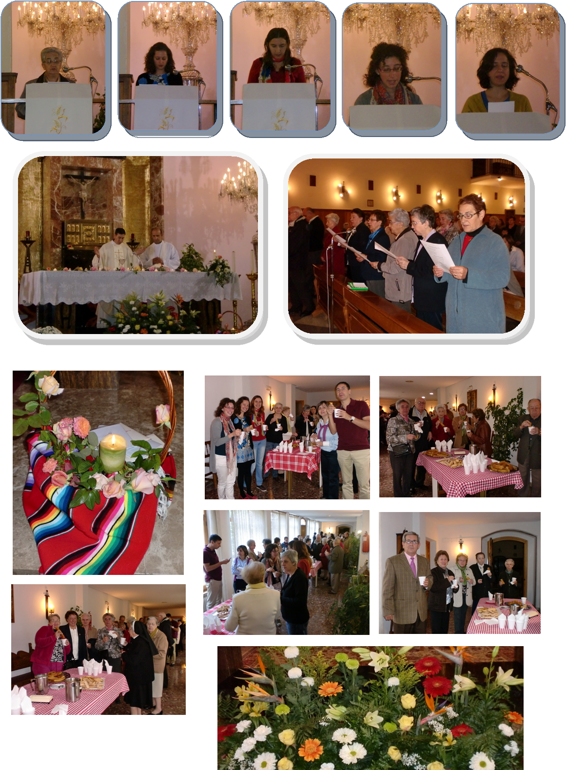 Celebramos la Eucaristía a las 9,15 de la mañana con las personas que acuden a nuestra iglesia. Por ser nuestra fiesta nos acompañan las Hnas. Hospitalarias y algunos Laicas y hermanas Oblatas que concluyen el encuentro de pastoral juvenil vocacional. Presiden la celebración Rafa Mas, sacerdote diocesano de Palma de Mallorca y Antonio Soler, parroco de Ciempozuelos.