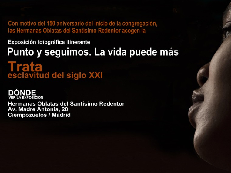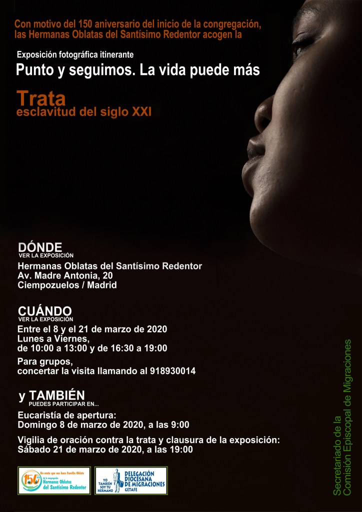 La comunidad de Hermanas Oblatas del Santísimo Redentor de Ciempozuelos acogemos la exposición itinerante ‘Punto y seguimos. La vida puede más’. La muestra, que ha sido realizada y promovida por la Sección de Trata de la Comisión Episcopal de Migraciones, podrá visitarse en la casa fundacional de la congregación (Avenida Reverenda Madre Antonia, 20) del 8 al 21 de marzo de 2020.
