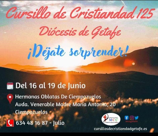 El Movimiento de Cursillos de Cristiandad ha programado para el fin de semana del 16 al 19 de junio el cursillo número 125, que tendrá lugar en la Casa de Espiritualidad de las Hermanas Oblatas (av. Venerable Madre María Antonia, 20. Ciempozuelos).