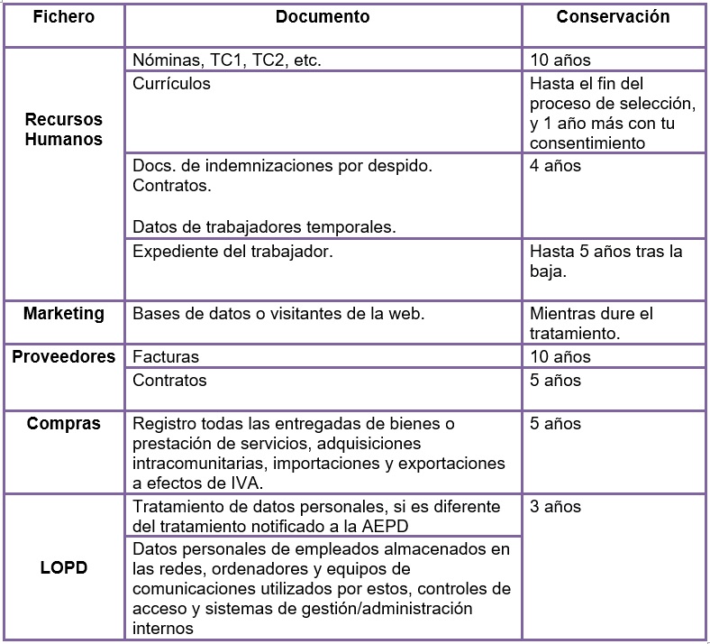 - En cada tratamiento o tipología de datos, te facilitamos un periodo específico, que puedes consultar en la siguiente tabla: